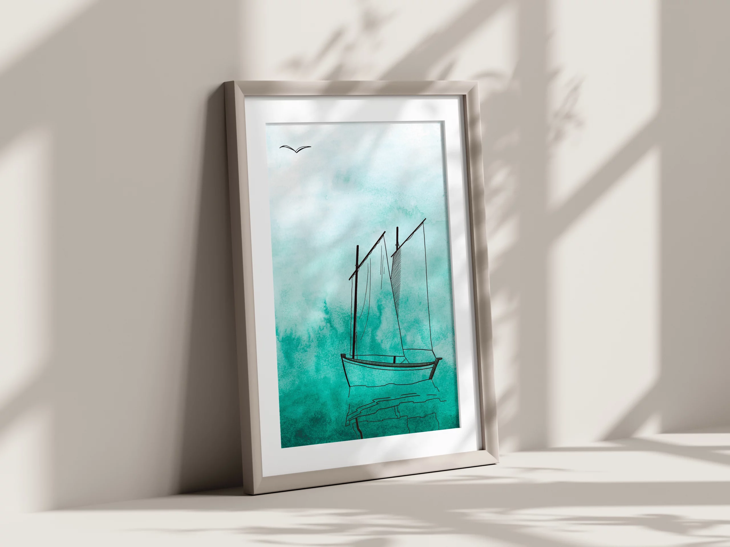 Traits fins sur une aquarelle turquoise (ou glaz en breton) réalisés à la main, imprimés sur du papier mat texturé de haute qualité Rives Tradition, 250 grammes, blanc naturel chez un imprimeur local.