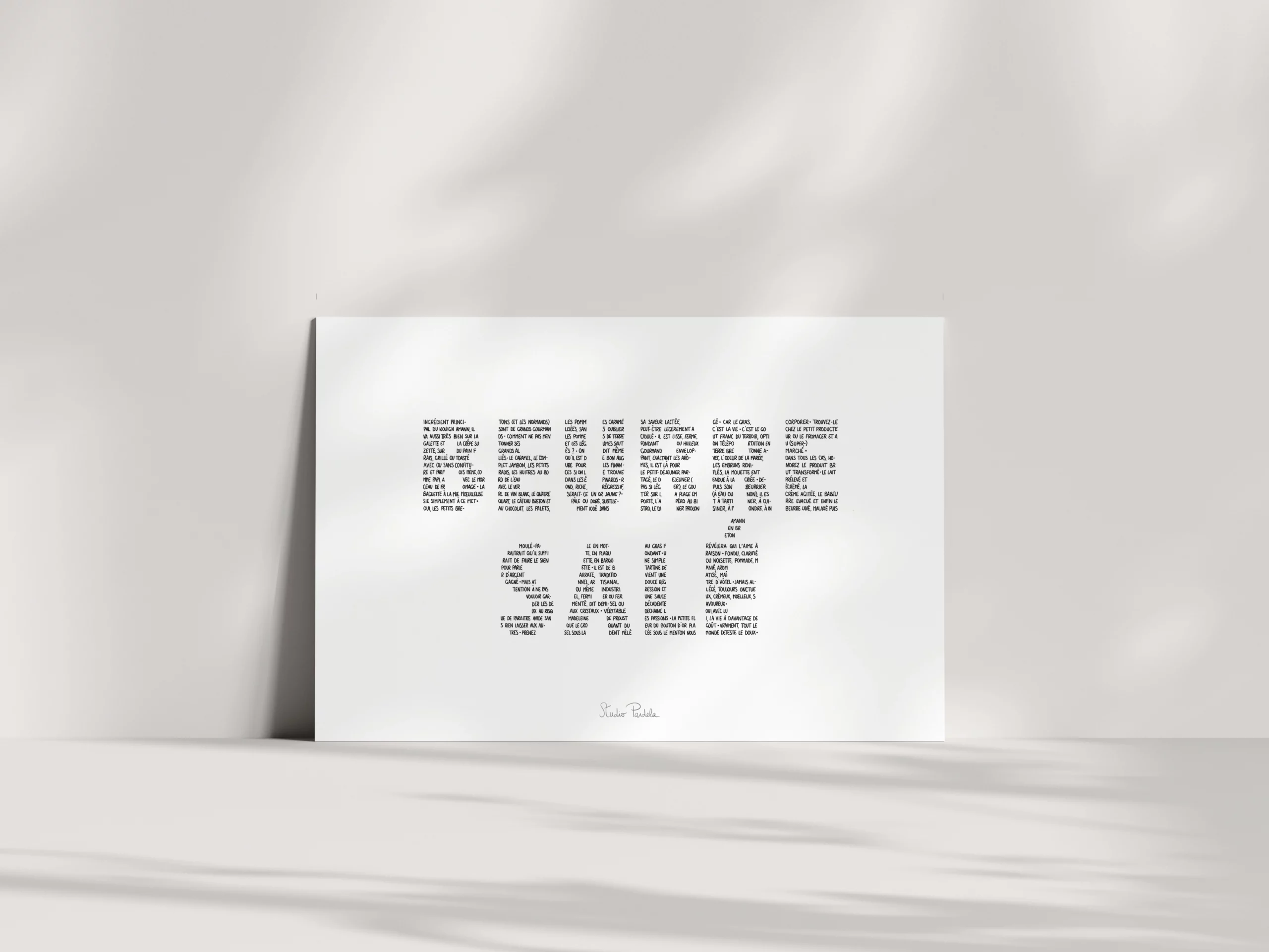 Typographie manuscrite aux traits fins réalisée à la main, imprimée sur du papier mat texturé de haute qualité Rives Tradition, 250 grammes, blanc naturel chez un imprimeur local.