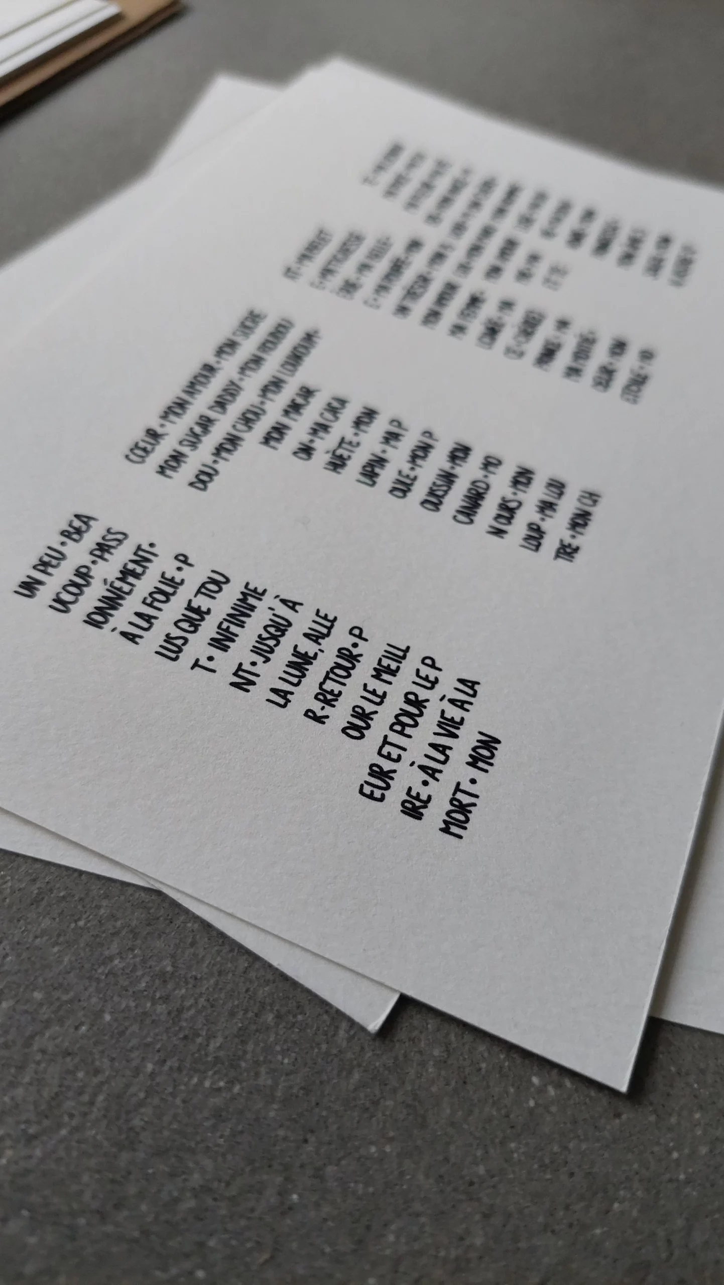 Typographie manuscrite aux traits fins réalisée à la main, imprimée sur du papier mat texturé de haute qualité Rives Tradition, 250 grammes, blanc naturel chez un imprimeur local.